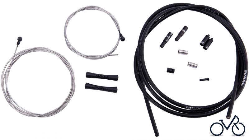 SRAM Renn-Bremszugkit "SlickWire Pro" SB-verpackt, bestehend aus: Außenhülle 1700 mm lang (5 mm, Kevlar verstärkt), Innenzug 850 mm und 1750 mm lang (1,5 mm, Edelstahl, beschichtet, schwarz), Anschlaghülsen, Endhülsen und 2 Rahmenschutzgummi