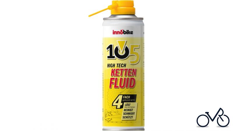 INNOBIKE Kettenspray "105 High Tech Kettenfluid" Reinigen und Schmieren in einem Arbeitsgang. Die Kombination verschiedener organischer Lösemittel auf Kohlenwasserstoffbasis in Verbindung mit schmieraktiven Substanzen sorgt für ein tiefes Eindringen in alle Ketteninnenlager, Kettentriebbuchsen und -zapfen, um dort alte Ablagerungen, Verharzungen und Schmutzpartikel zu lösen und auszuspülen. Durch langsames Abdunsten der lösenden Inhaltsstoffe verbleibt nur die schmieraktive Substanz, die einen nicht klebenden, grifffesten und tragfähigen Schmierfilm an der Kette, insbesondere aber in den kritischen Bereichen der Ketteninnenlager aufbaut.